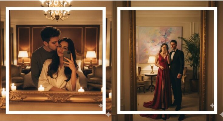 “Combine both photos into a natural couple mirror selfie.Do NOT change the girl’s original pose, face, expression, or direction.Automatically adjust and match the boy’s pose, body angle, head tilt, hand position, and mirror-facing direction exactly according to the girl’s photo so they look naturally standing together.Ensure both appear in the same lighting, shadows, environment, and color grading so the blend looks seamless.Keep both faces completely unchanged and realistic.Use ultra-realistic 8K DSLR clarity, soft lighting, clean reflections, and accurate mirror balance.If the girl’s photo is replaced later with a different one, automatically readjust the boy’s pose and direction to match the new girl photo exactly, without changing his face or realism.”